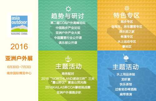 今年,亞洲戶外展匯集650多家戶外用品參展商和品牌,展會(huì)規(guī)模4.8萬平方米,是一場屬于戶外品牌、屬于媒體朋友、屬于親愛的專業(yè)觀眾們的戶外盛筵。2016年,亞洲戶外展將有機(jī)結(jié)合靜態(tài)展示、場景體驗(yàn)、趨勢研討三種展覽形態(tài),實(shí)現(xiàn)傳統(tǒng)優(yōu)勢與新興板塊完美嫁接,并匠心策劃一系列聚合品牌、經(jīng)銷商、媒體、俱樂部、賽事組織等優(yōu)勢資源的現(xiàn)場活動(dòng)。